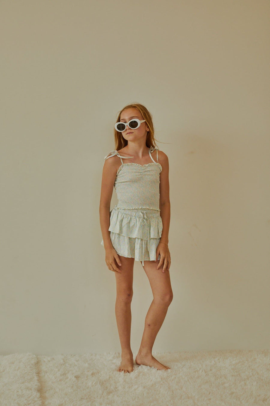 Gemma White Heart & Flower Eyelet With White Ribbon Smocked Ruffle Mini Skirt