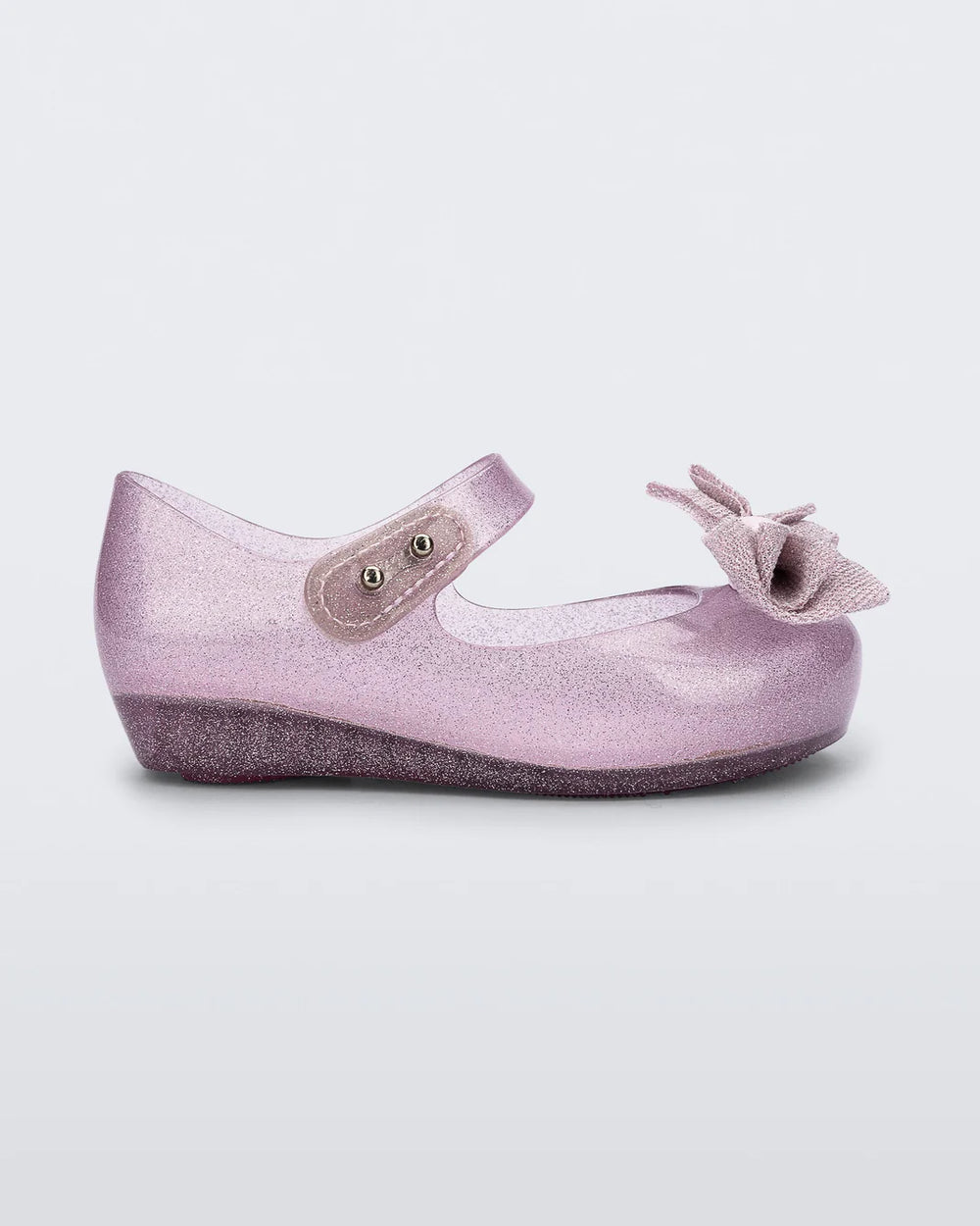 Description : Meet the cutest addition to your baby's wardrobe, the Mini Melissa Ultragirl Sweet. This adorable ballet silhouette features a precious maxi bow and a cozy insole for those tiny feet. It's designed for every special moment, from birthdays to playdates, and anything in between. Ballet flat style Light-as-air construction Wear-resistant Melflex upper Soft insole for comfort Decorative burlap bow and toe peep Upper: 84% PVC + 10% polyester + 2% metal + 4% Velcro Insole: Laminated PVC Sole: 100% PVC Bubblegum scent