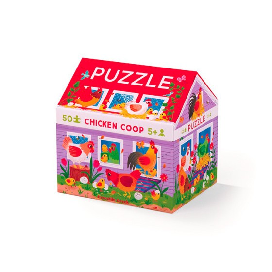 Description : Chickens Galore! Our 50-piece Chicken Coop puzzle in a 3D-shaped box will delight the little ones in your world. It’s fun, challenging, and educational too! Featuring bold colors and a whimsically illustrated puzzle that encourages hand-eye coordination and problem-solving. A sturdy house-shaped box makes for easy storage and its small size is perfect for travel. 50 puzzle pieces that fit together well for children 5 and older Encourages hand-eye coordination, fine motor skills and problem solving Puzzle pieces are made of strong, high-quality blue board that will not tear or break. Printed with soy-based inks Beautifully illustrated artwork on both the puzzle and shaped storage box