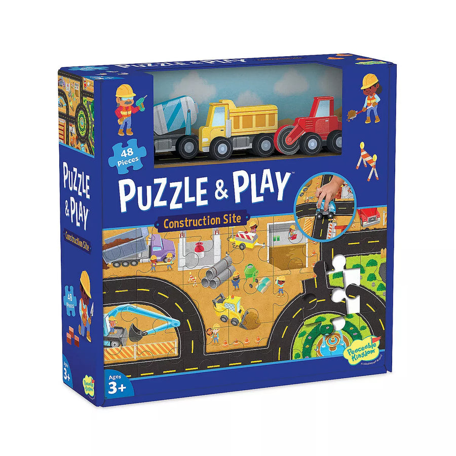 Description : 3 wooden construction vehicles with working wheels Visual recognition, cooperation, fine motor development, problem solving and cognitive skills Completed puzzle measures 26” x 36” Age Recommendation: 3 & Up