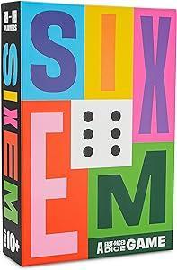 Description : INTRODUCING SIXEM: A DICE GAME LIKE NO OTHER! Prepare for hours of excitement with SIXEM, the newest creation from Hootenanny Games. Perfect for 2-4 players and ages 10 and up, this game combines strategy, speed, and sabotage to create a thrilling experience for family and friends. FAST-PACED ACTION, ENDLESS FUN: The goal is simple be the first to line up your Xs by rolling the perfect combination of numbers and colors. Roll and re-roll your dice as fast as you can to be the first to get 1 through 6 on your dice. Then yell STOP, freezing all players in their tracks! STRATEGIZE AND SABOTAGE: SIXEM isn't just about luck; it's about smart moves. And theres a twist! Roll a number/color combo matching an X on your board? Use it to your advantage by erasing that X from an opponent's board. It's a game where every roll can turn the tables! EASY TO LEARN, A JOY TO PLAY: No complicated rules here SIXEM is easy to learn in just a few minutes, making it perfect for both casual and seasoned players. With its vibrant design, including 24 colorful dice, 4 boards, 4 markers, and 1 spinner, this game is a visual treat as well as a brain teaser. PERFECT FOR ANY OCCASION: Whether it's a family game night, a party with friends, or a casual hangout, SIXEM fits right in. With an average gameplay of 15-30 minutes, it's the ideal choice for entertainment that's both quick and captivating. CONVENIENT HOW-TO-PLAY VIDEO: Get right into the action with our online How-to-Play video. Its game night made effortless and more fun! Get ready to roll with SIXEM the game that combines strategy, speed, and a dash of mischief in one exciting package. Perfect for anyone who loves a good challenge with a side of fun! Six dice. Six rows. Endless kicks as you roll to six!