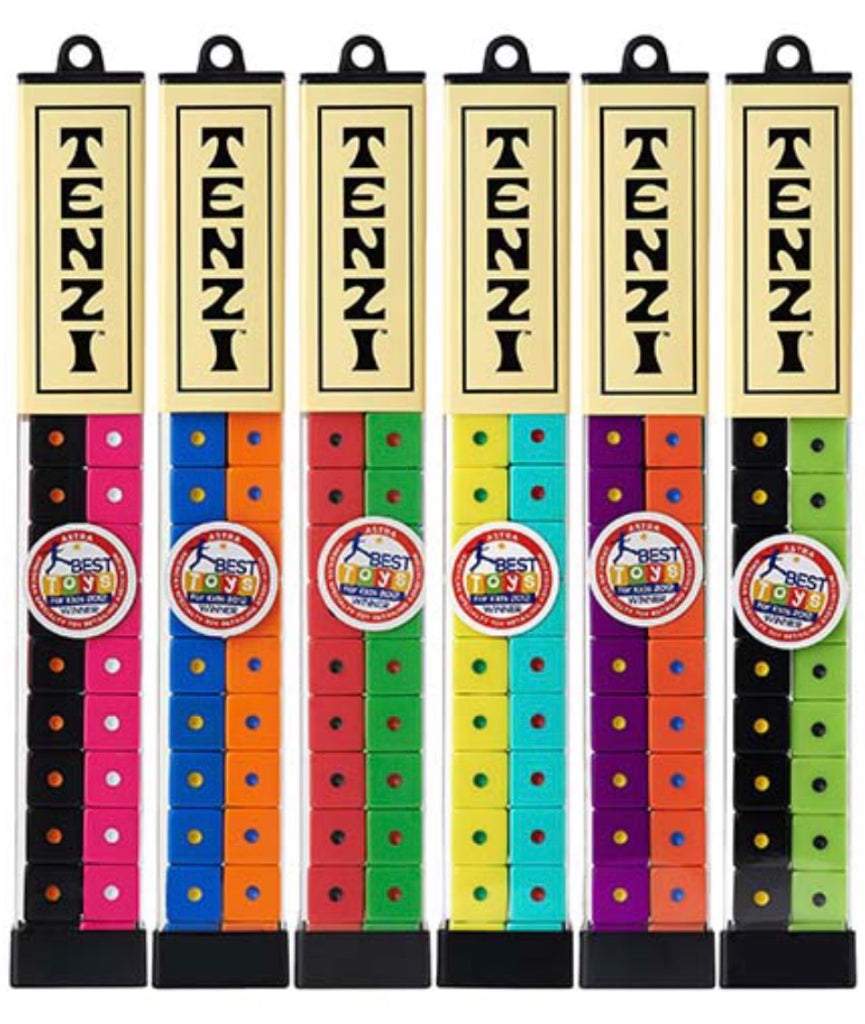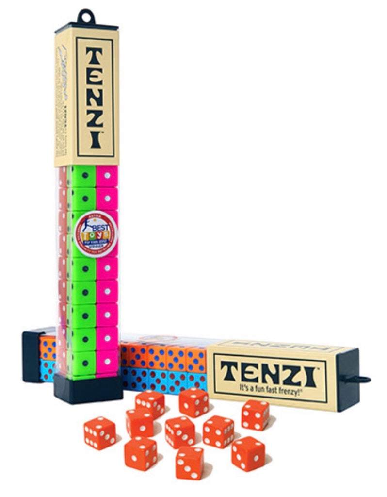 Description : The worlds fastest game! Everyone gets ten dice. Someone says, Go. Then everyone rolls and rolls as fast as they can until someone gets all their dice on the same number and shouts TENZI. Lots of different ways to play. A fun fast frenzy for the whole family! colors vary